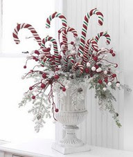 You often see large candy canes from plastic or glass, but what do you do with them to make an interesting display?  This is a simple idea easily put together from the dollar store.  The white vase is the necessary part. It has interesting details and height and is the prefect sophisticated element to add oomph to this design.